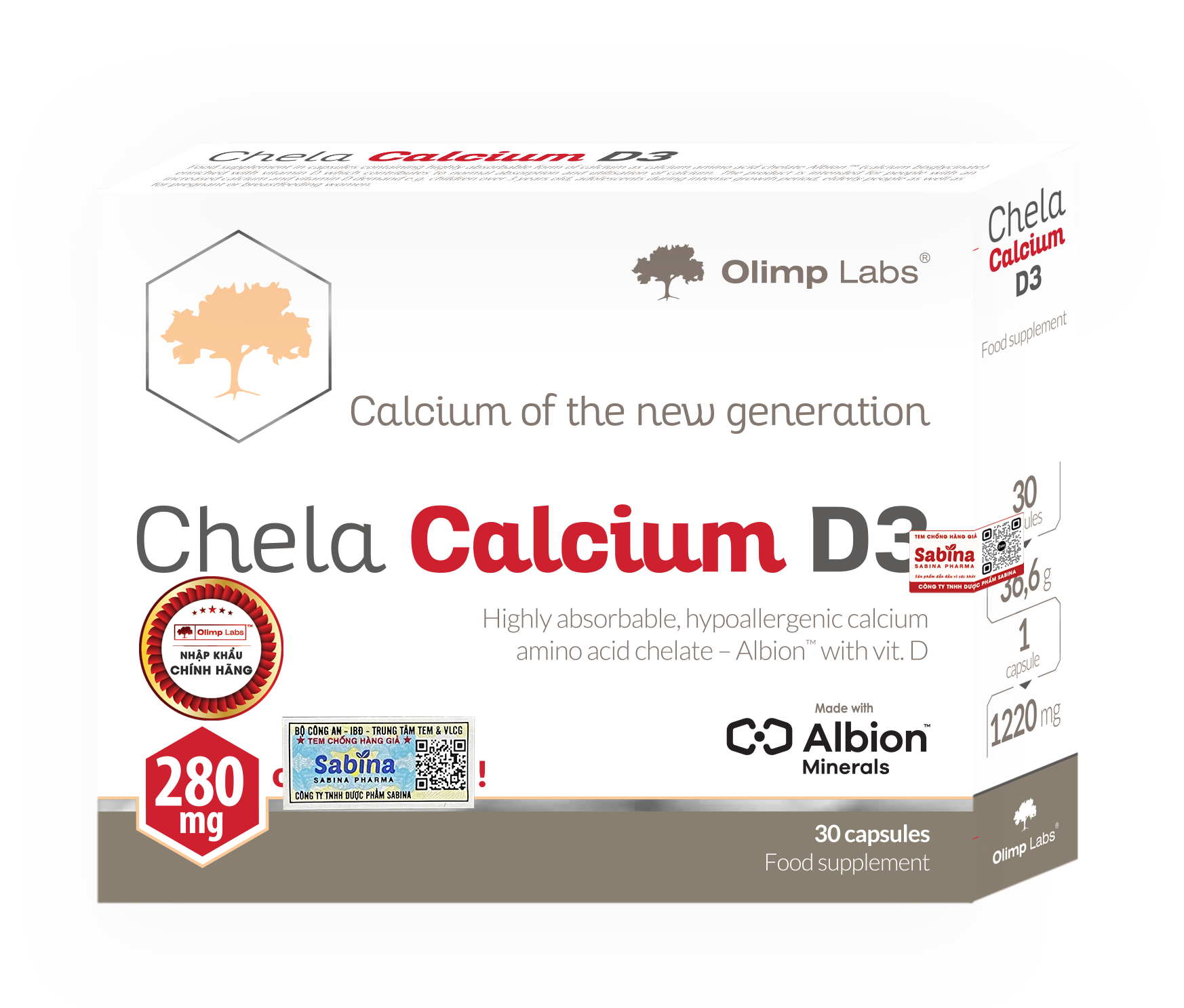 Thành phần: 88,3% calcium biglycinate ( calcium amino acid chelate Albion ®), 0,05% cholecalciferol – vitamin D. Phụ liệu: microcrystal line cellulose; chất chống vón – muối magnesium của các axit béo; (genlatine, màu: E171)